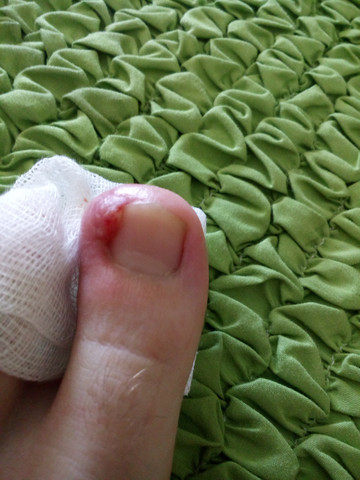 Ich will nicht nächste Woche gesagt bekommen dass ich zum Chirugen muss. Dazu wird ein wattierter Pflasterstreifen zwischen den Nagel und den entzündeten Nagelwall geschoben.